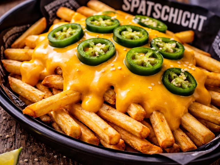Knusprige Pommes, überzogen mit cremigem, heißem Käse